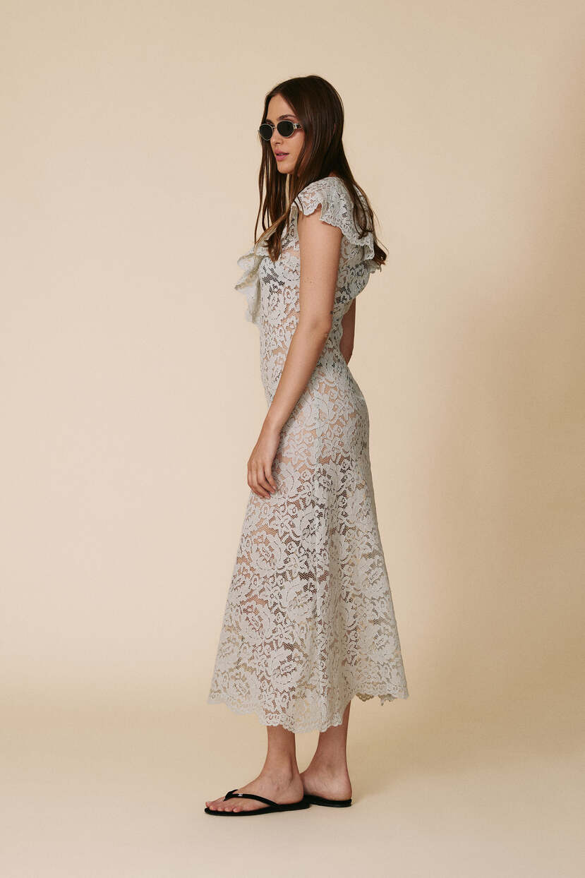 HOME - CLOTHING - Dresses - Midi-Light Green Midi Lace Dress With Ruffled Neckline